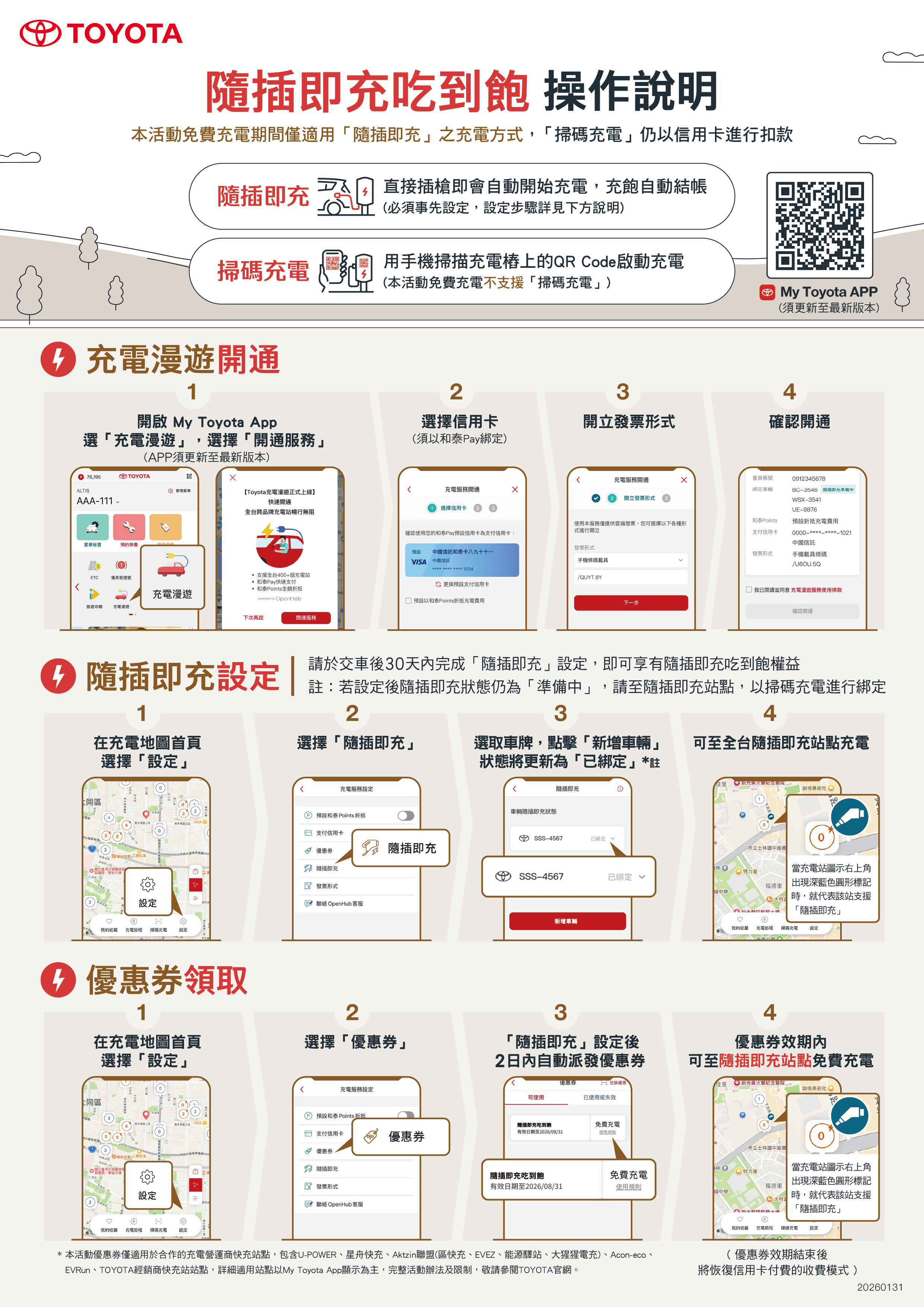 - 本優惠券效期屆滿後,隨插即充服務將自動恢復為付費機制,由綁定隨插即充用戶支付充電費用。充電費用將依 My Toyota APP 內公告之即時費率為準,敬請用戶自行留意優惠結束日期。