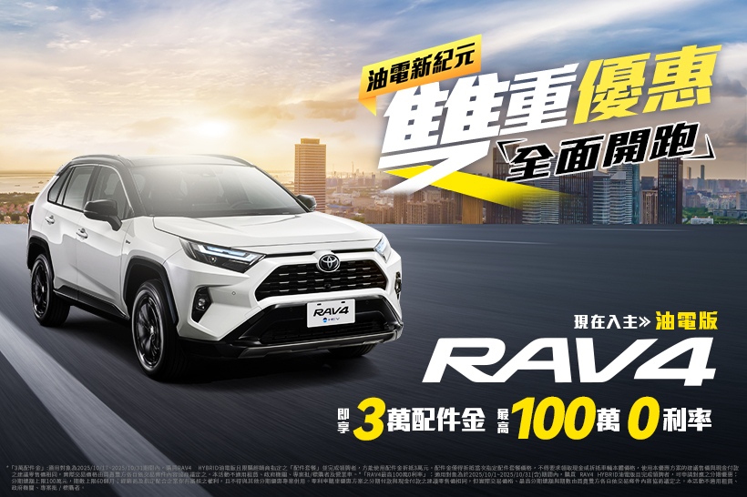 「3萬配件金」 : 適用對象為2025/10/17~2025/10/31期間內,購買RAV4 HYBRID油電版且限購經銷商指定之「配件套餐」並完成領牌者,方能使用配件金折抵3萬元。配件金僅得折抵當次指定配件套餐價格,不得要求領取現金或折抵車輛本體價格,使用本優惠方案的建議售價與現金付款之建議零售價相同,實際交易價格由買賣雙方各自依交易條件內容協商議定之。本活動不適用租賃、政府機關、專案批/標購者及營業車。