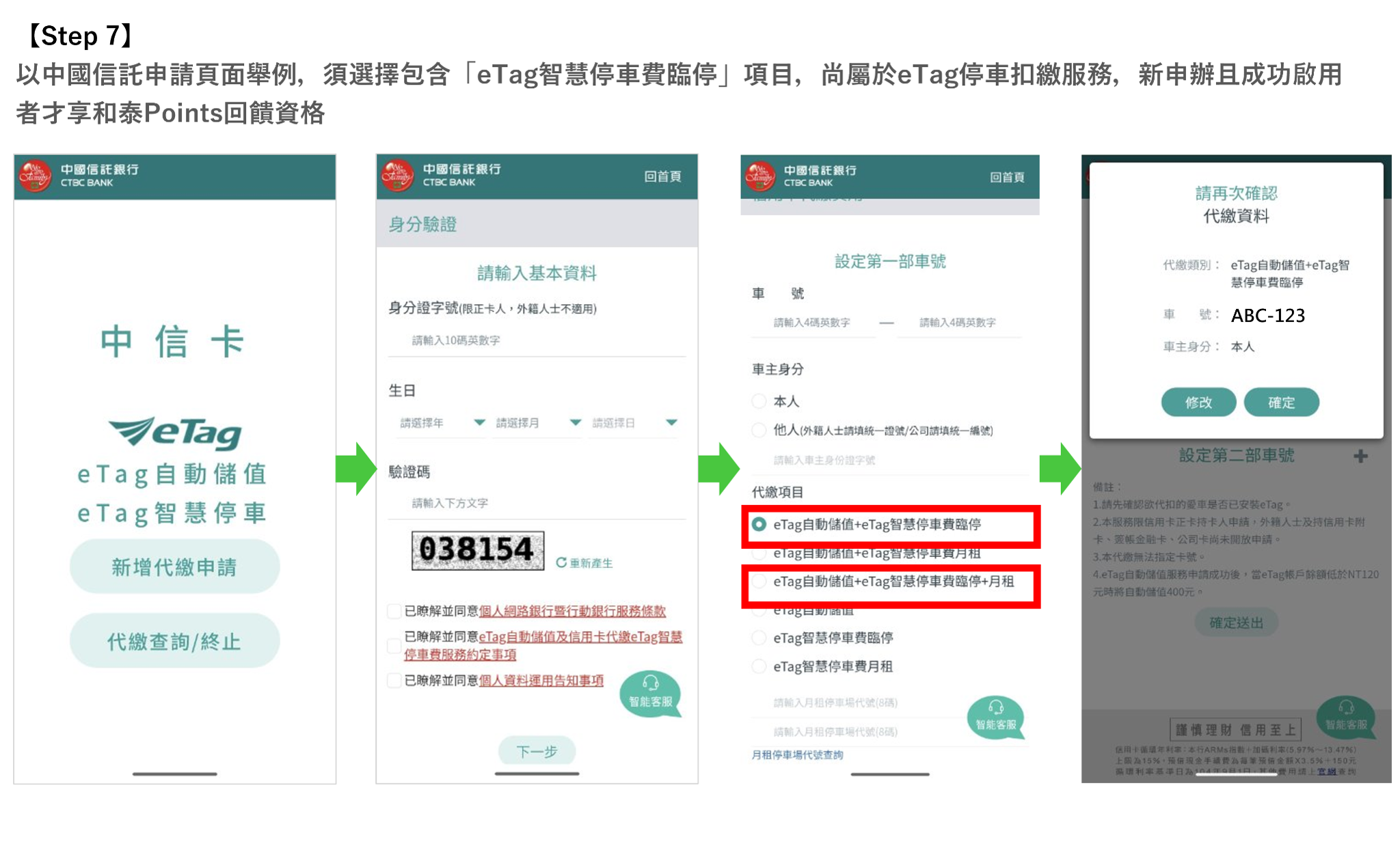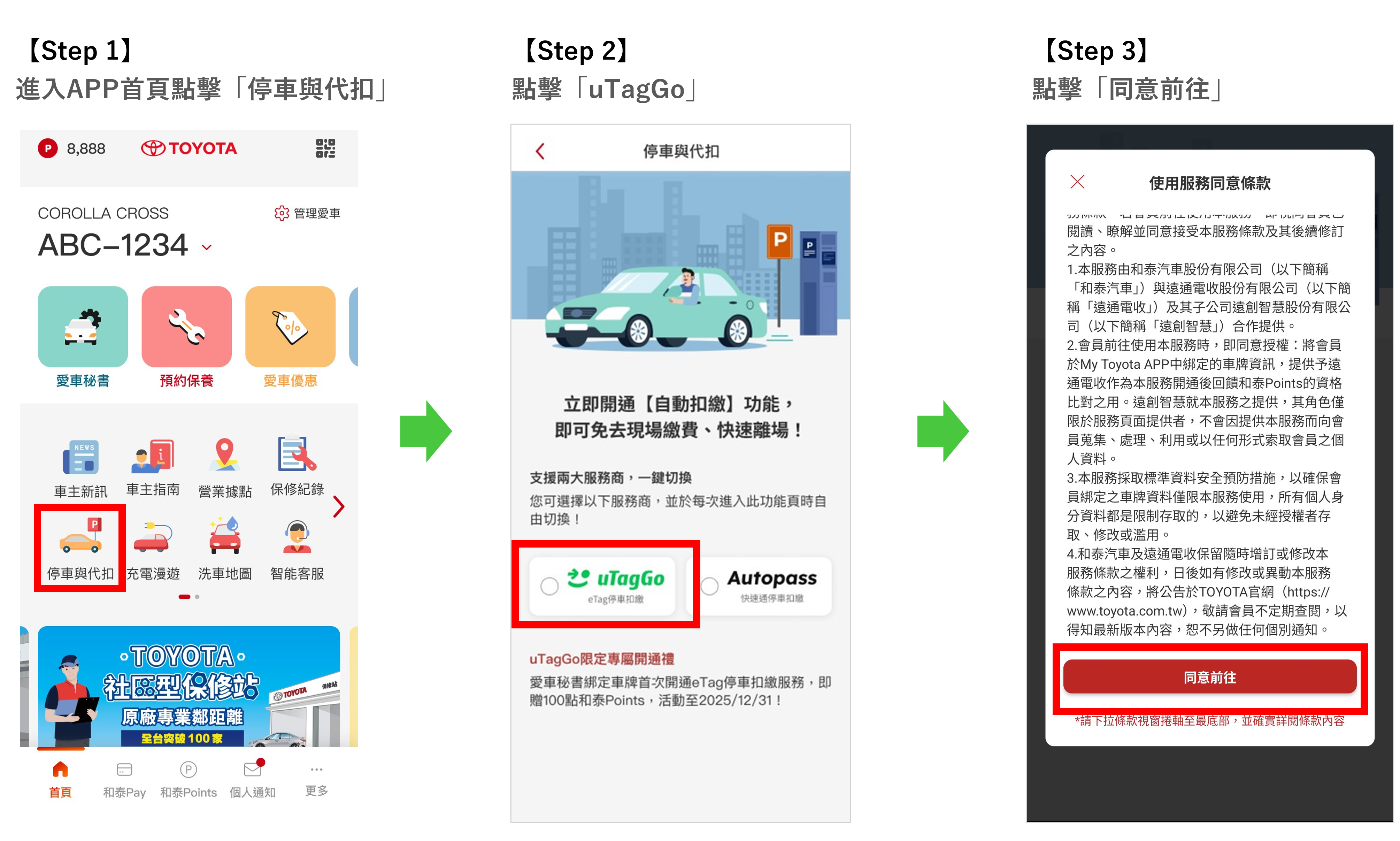 TOYOTA車主優惠|新申辦uTagGo「eTag停車扣繳」服務,贈50點Points 2026.01.07 活動期間:2026/1/1/(四)~2026/2/28(六) 適用對象:和泰集團會員(TOYOTA車主)從「My Toyota APP」中,前往開通eTag停車扣繳服務的新申辦用戶(限TOYOTA車牌) 活動辦法:每一車號於活動期間內新申辦並啟用「eTag停車扣繳」服務,即可獲得和泰Points 50點 回饋說明: 和泰Points 50點:每一車號新申辦並成功啟用eTag停車扣繳服務成功後,將於2026/3/31(二)前自動匯入和泰Points至符合活動條件者所綁定之和泰集團會員帳戶,點數可於HOTAI購商城、原廠保養、精品、及My Toyota APP中之停車、充電等消費折抵使用註1。 透過「My Toyota APP」立即申辦:https://charging.toyota.com.tw?link=parkingBrand 同步下載uTagGo APP,進入eTag停車扣繳合作停車場,開啟享停車進出場通知,避免重覆繳款、還有查詢發票/一鍵報帳貼心服務更便利~立即下載:https://link.utaggo.com.tw/aL9aS 註1:以上可折抵內容,敬請參照各合作通路活動辦法或TOYOTA官網、Lexus官網、HINO官網、HOTAI購、yoxi、去趣詳細說明。本活動發放之和泰Points點數效期為自發點日起至發點日滿2年之當月末日。其他詳細說明(含取得點數之資格限制)請參下方【注意事項】。 【注意事項】 本次活動主辦單位為和泰汽車股份有限公司(以下簡稱「主辦單位」)。參加者參加本活動同時,即同意受本活動「注意事項」、「和泰集團會員個人資料告知事項」之規範,如有任何違反之情事,主辦單位得取消其中獎資格,並對於任何破壞本活動之行為行使法律追訴權。 活動期間:西元(下同)2026年1月1日起至2026年2月28日(含)為止。 參加活動者需同時達成以下兩條件,始符合和泰Points回饋: 和泰集團會員(TOYOTA車主)於活動期間內新申辦並啟用eTag停車扣繳服務,須選擇包含「智慧停車」且為「臨停」的項目(若僅選擇「eTag自動儲值」或「eTag智慧停車月租」或「eTag自動儲值+ eTag智慧停車月租」皆不包含在eTag停車扣繳服務裡,故不符合回饋資格)。 和泰集團會員申辦啟用eTag停車扣繳服務的TOYOTA車牌,該車牌於活動期間內須全程於My Toyota APP裡綁定愛車秘書。 和泰Points入點時間將於2026/3/31(二)前自動匯入符合活動條件者所綁定之和泰集團會員帳戶。本活動發放之和泰Points點數效期為自發點日起至發點日滿2年之當月末日。點數一經發送後,如有遺失、盜領、損毀等情事發生,主辦單位不負補發之責,參加者同意主辦單位對所有因使用或領取點數之後果無須負責,且不負任何擔保責任。和泰Points使用規則及合作通路相關內容請參考和泰集團會員服務官方網站。(https://www.hotaimember.com.tw/hotaipoints/) 參加者若以惡意之電腦程式、違反法律及其他不正當或違反活動公平性之方式,混淆或影響活動結果者,一經主辦單位發現或經第三人檢舉,主辦單位除得立即取消參加活動資格外,若參加者已受領獎品,主辦單位並得追回獎品,若獎品有任何滅失或無法繳回者,領獎者並應按市價賠償。參加者對於因違反相關規定所產生之一切法律責任,應自行負擔,概與主辦單位無涉。 參加者同意所留存或產生之任何參與本活動的資料或記錄,皆以主辦單位之電腦系統與時間紀錄為準。本活動如任何因電腦、網路、電話、技術或其他不可歸責於主辦單位之事由,而使參加者所登錄之資料有遺失、錯誤或毀損所導致資料無效之情況,主辦單位不負任何法律責任,參加者與中獎者亦不得異議。 主辦單位保留修改本活動及獎品、審查參加者資格等之權利,並保留隨時取消、終止、修改或暫停與調整活動內容、活動辦法、注意事項、活動進行方式等相關細節之權利,無須作事前通知,亦有權對本活動之所有事宜作出補充、解釋或裁決。如有前述修改,將於TOYOTA官網公告,不另做通知。 若因本活動發生訴訟時,以臺灣臺北地方法院為第一審管轄法院。 對本活動如有任何疑義或問題,請聯繫主辦單位【和泰汽車-活動小組】(event@hotaimotor.com.tw)。 為了行車安全,請您與服務廠聯繫,以便備好相關零件後,安排您回廠實施。 回列表頁 關閉 維修據點查詢